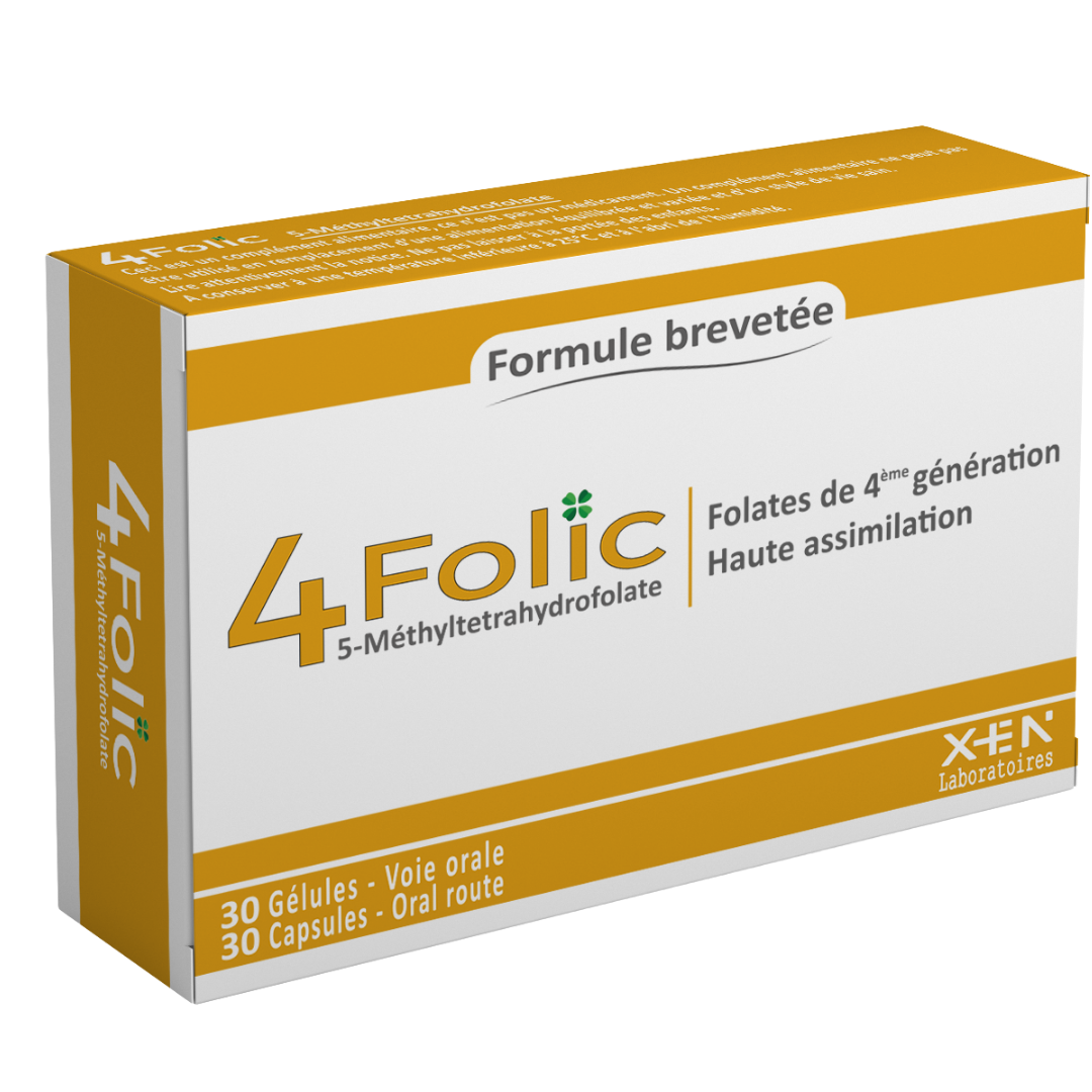 4 FOLIC est un complément alimentaire formulé à base de Quatrefolic, une forme de 5-méthyltétrahydrofolate de quatrième génération, reconnue comme la forme la plus active et la mieux assimilée de la vitamine B9.