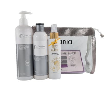 Le Pack Hydra Hair Alania comprend un Shampoing Réparateur Prodige (400ml), un Après-Shampoing Réparateur Prodige (250ml) et un Bain d’Huile Alania Jardin Secret (150ml) offert. Ce soin capillaire complet hydrate, nourrit et fortifie les cheveux tout en leur apportant brillance, vitalité et souplesse. Il lutte contre la chute des cheveux et favorise leur repousse.